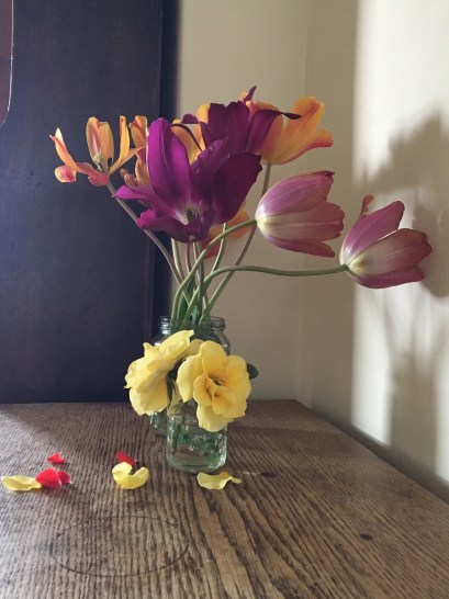Tulips going over, and the sweet scent off a climbing rose, two of life’s great pleasures.